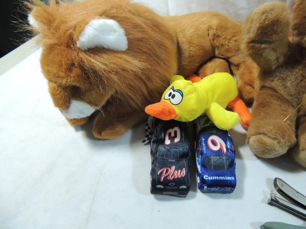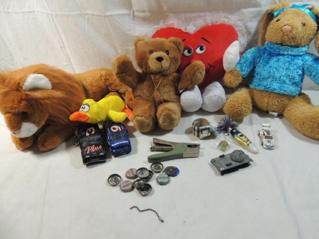 BOTTLE CAPS, MAGNET, STAPLER, DIE CAST TOY CAR, SNAP BRACELET, CHACTER PEN, TOY TANK, WALMART PIN AND ASSORTED STUFFED ANIMALS NASCAR CARS. BUNNIES, HEART, TEADY BEAR, DUCK. AS SHOWN.SEE PHOTO FOR MORE DETAILS.