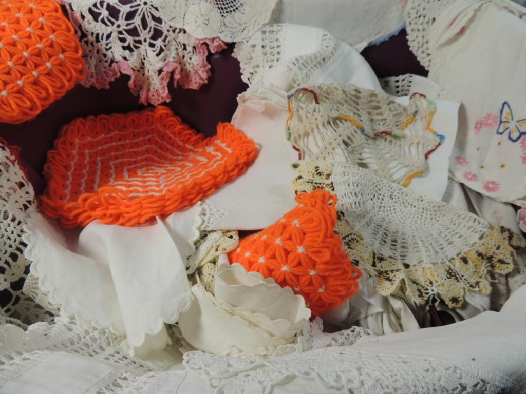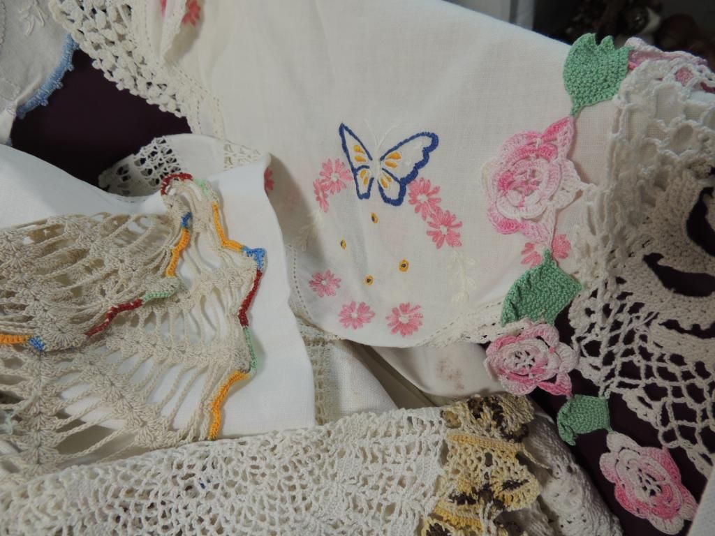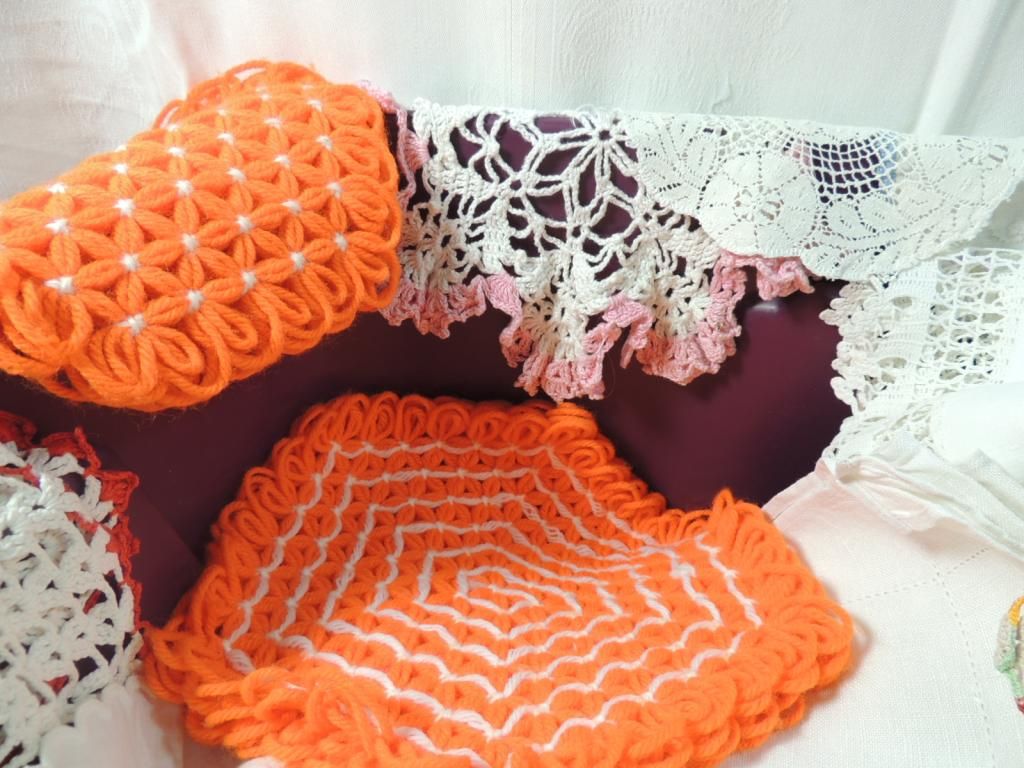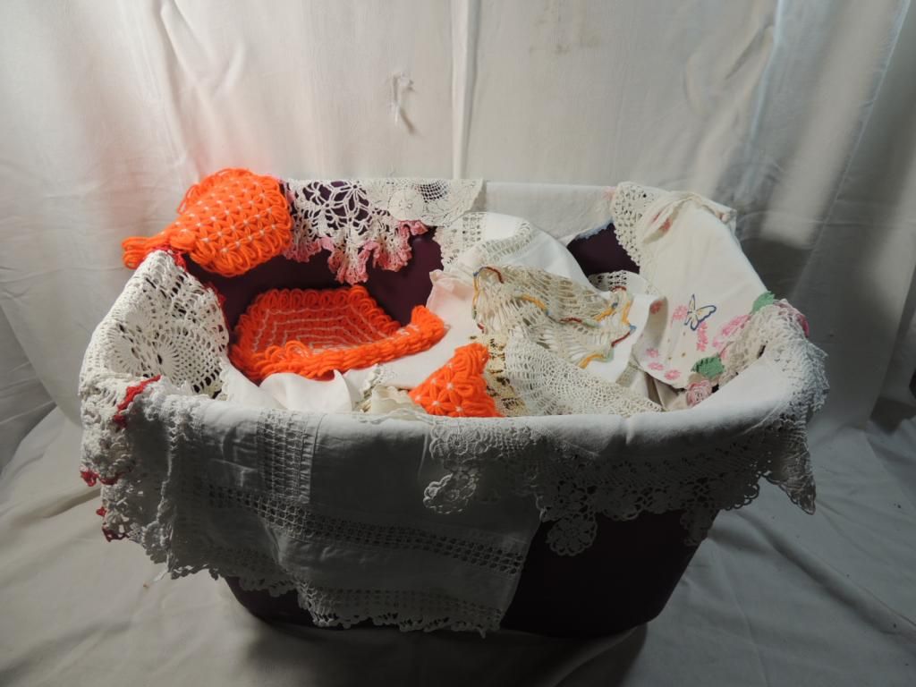 VINTAGE LINENS, NAPKINS, RUNNERS, DOLIES, NEEDLE POINT, MIXED. ASSORTED STYLES, SIZES, COLORS. AS SHOWN. SEE PHOTO FOR MORE DETAILS.