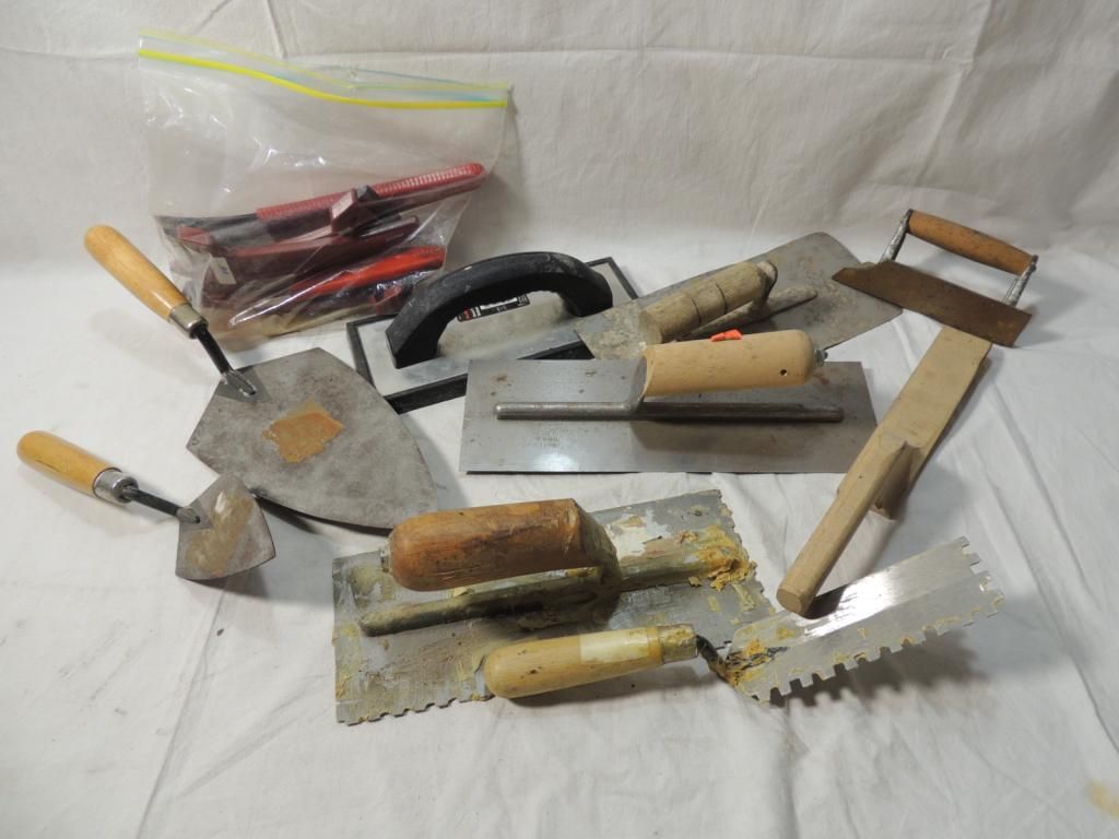 BOX LOT ASSORTED TROWELS. POINTING RECTANGLE AS SHOWN. SEE PHOTO FOR MORE DETAILS.