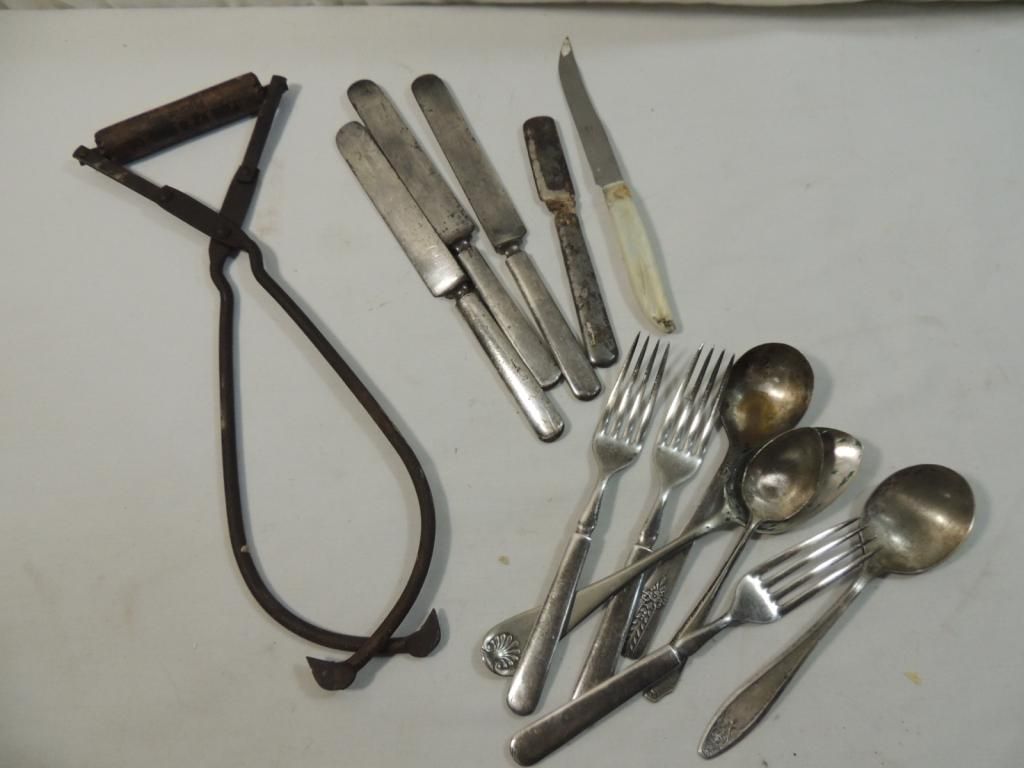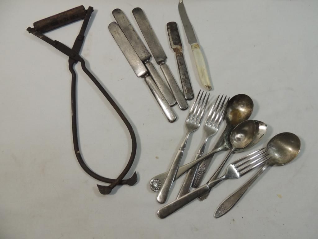 SILVER PLATED? KNIFES FORKS SPOONS ANTIQUE ICE HOOK. AS SHOWN SEE PHOTO FOR MORE DETAILS.