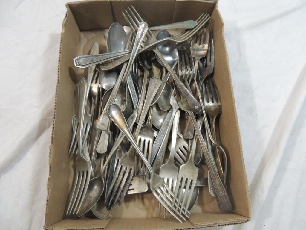 SILVERWARE, FLATWARE, SILVERPLATED? SPOONS, KNIVES, FORKS, COLLECTIBLE, VINTAGE AS SHOWN SEE PHOTO FOR MORE DETAILS.