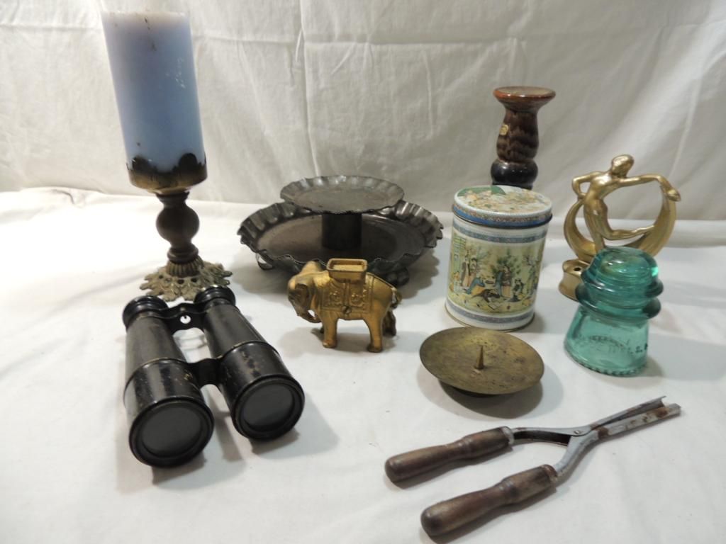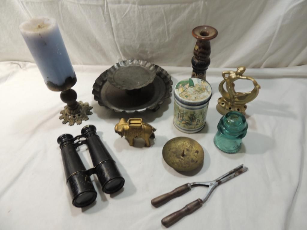 CANDLE STICKS, METAL AND CERAMIC, TIN, VINTAGE BIONOCULARS DESSERT TRAY AND MORE AS SHOWN SEE PHOTO FOR MORE DETAILS.