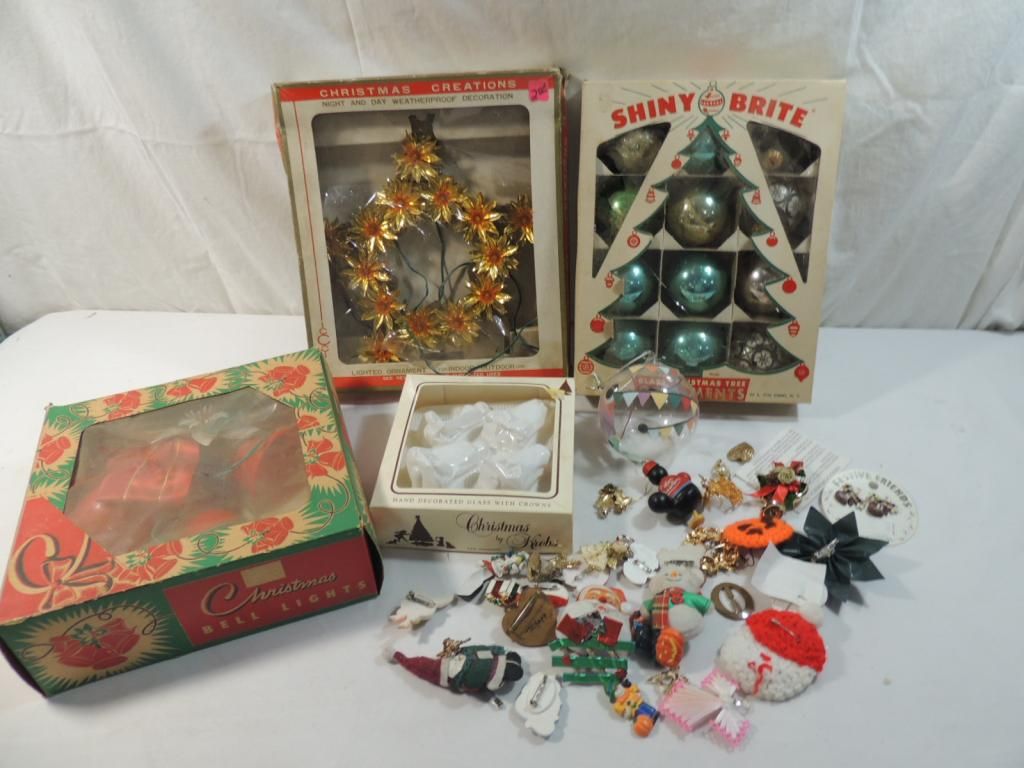 VINTAGE ORNAMENTS SHINY BRITE, CHRISTMAS TREE TOP STAR, CHRISTMAS BELLS. SMALL ORNAMENTS. AS SHOWN SEE PHOTO FOR MORE DETAILS.