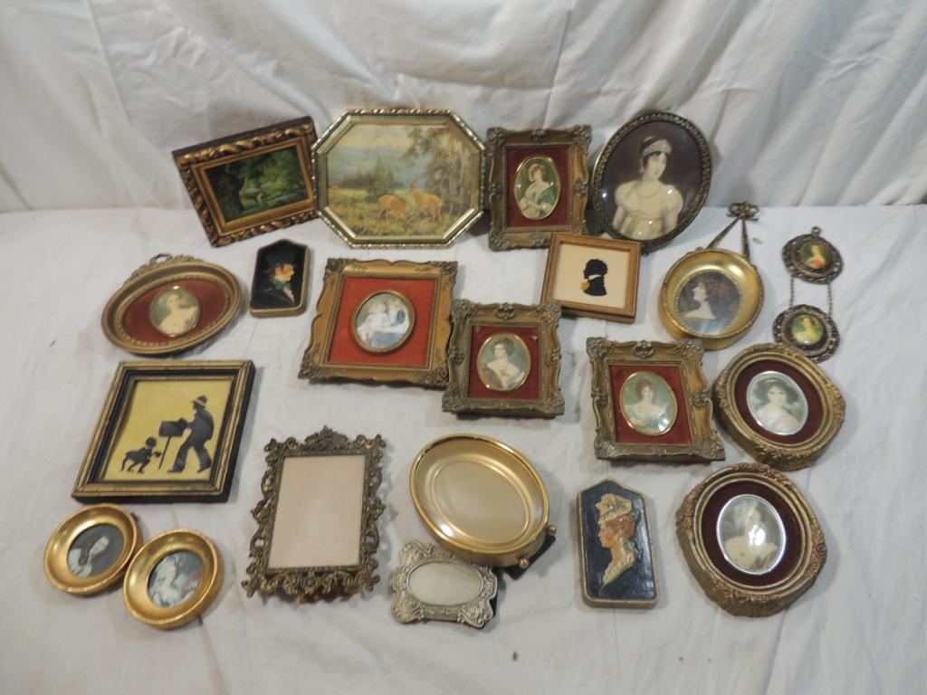GOLDTONE DECORATIVE FRAMES, VINTAGE FRAMES, SMALL FRAMES, SMALL PAINTINGS, PRINTS, DECORATIVE, BARQUE, AS SHOWN SEE PHOTO FOR MORE DETAILS.