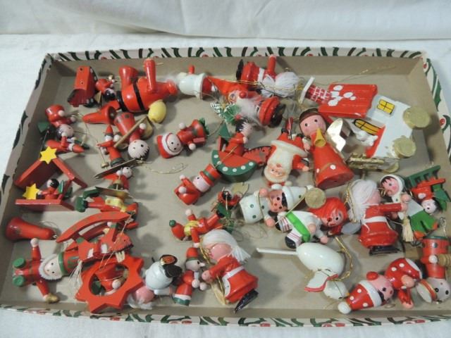 WOODEN ORNAMENTS, CHRISTMAS ORNAMENTS, VINTAGE WOODEN ORNAMENTS, PEOPLE ORNAMENTS HOLIDAY DECOR, AS SHOWN SEE PHOTO FOR MORE DETAILS.