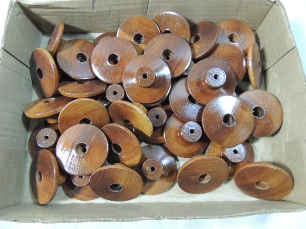 BOX LOT ASSORTED WOODEN HANDLES PULLS AS SHOWN SEE PHOTO FOR MORE DETAILS.