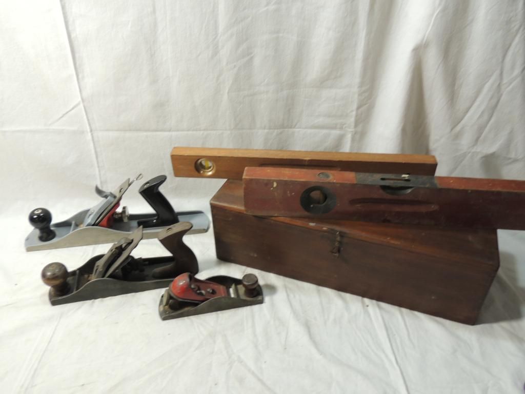 ASSORTED WOODEN PLANES AND LEVELS. WOOD WORKING TOOLS. AS SHOWN. SEE PHOTO FOR MORE DETAILS. WOODEN BOX. AS SHOWN.