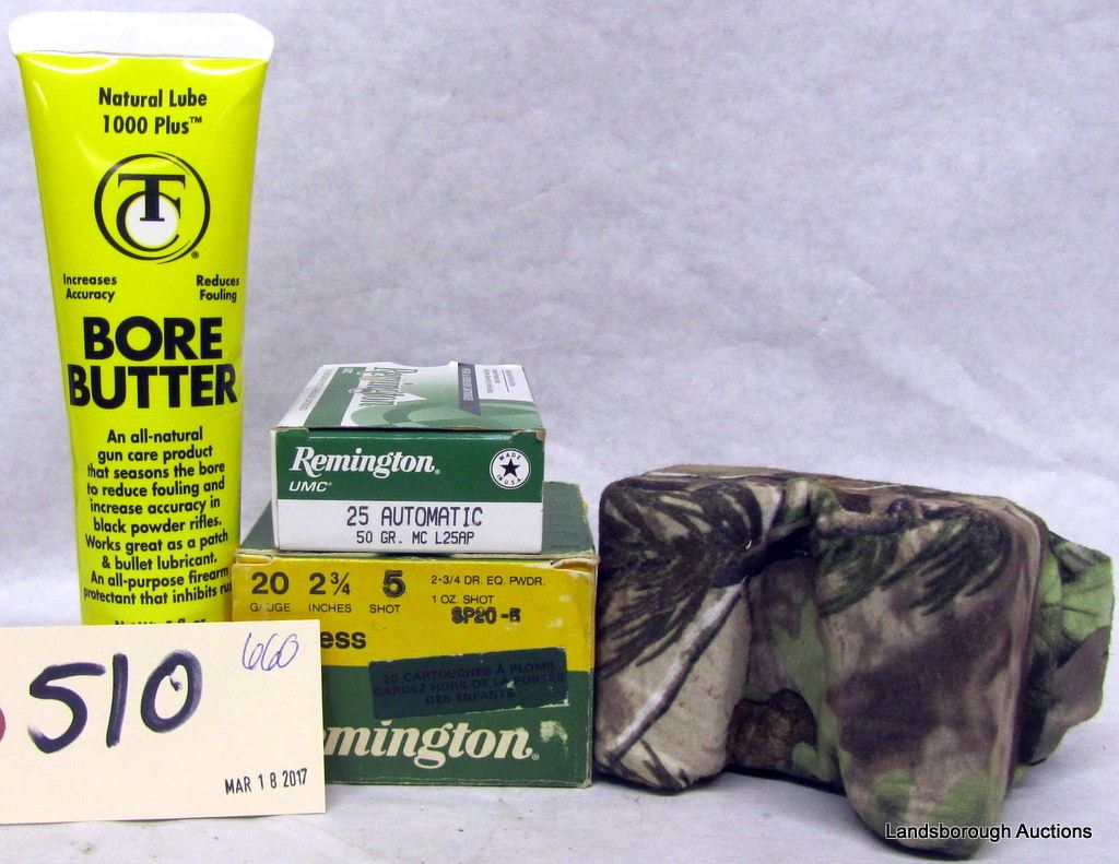 24 RNDS REMINGTON EXPRESS 20GA 2 3/4" 5 SHOT 1 OZ, 50 RNDS REMINGTON UMC 25 AUTOMATIC 50GR MC, ONE CAMO RIFLE REST, AND ONE FULL TUBE (5 FL OZ) OF THOMPSON CENTRE BORE BUTTER