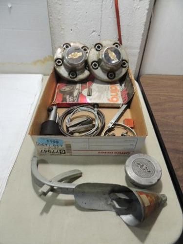 BOX LOT AUTOMOTIVE PARTS & TOOLS: OIL FILLER, GAP MEASURE TOOLS, CHEVY TRUCK HUB CAPS, PROTECTIVE STRIP FOR SID EOF CAR AND MORE. AS SHOWN. VIEW PICTURE FOR DETAIL.