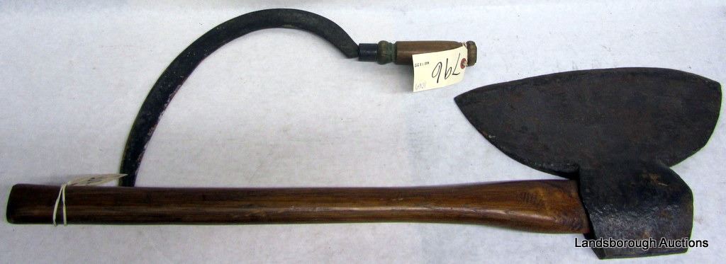 ONE VINTAGE BROAD AXE AND ONE VINTAGE SICKLE