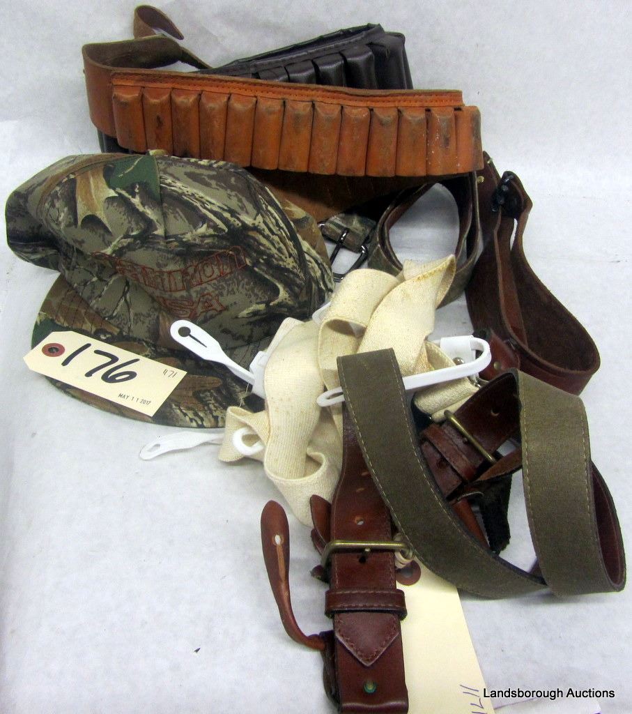 TWO SUSPENDERS, TWO LEATHER AMMO BELTS, ONE AMMO SLING, ONE CAMO BELT, AND ONE CAMO HAT
