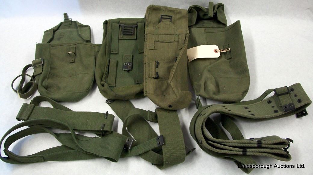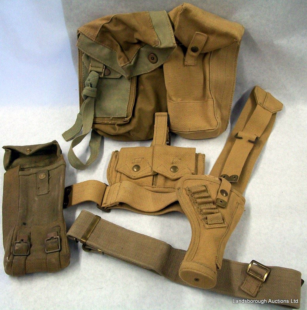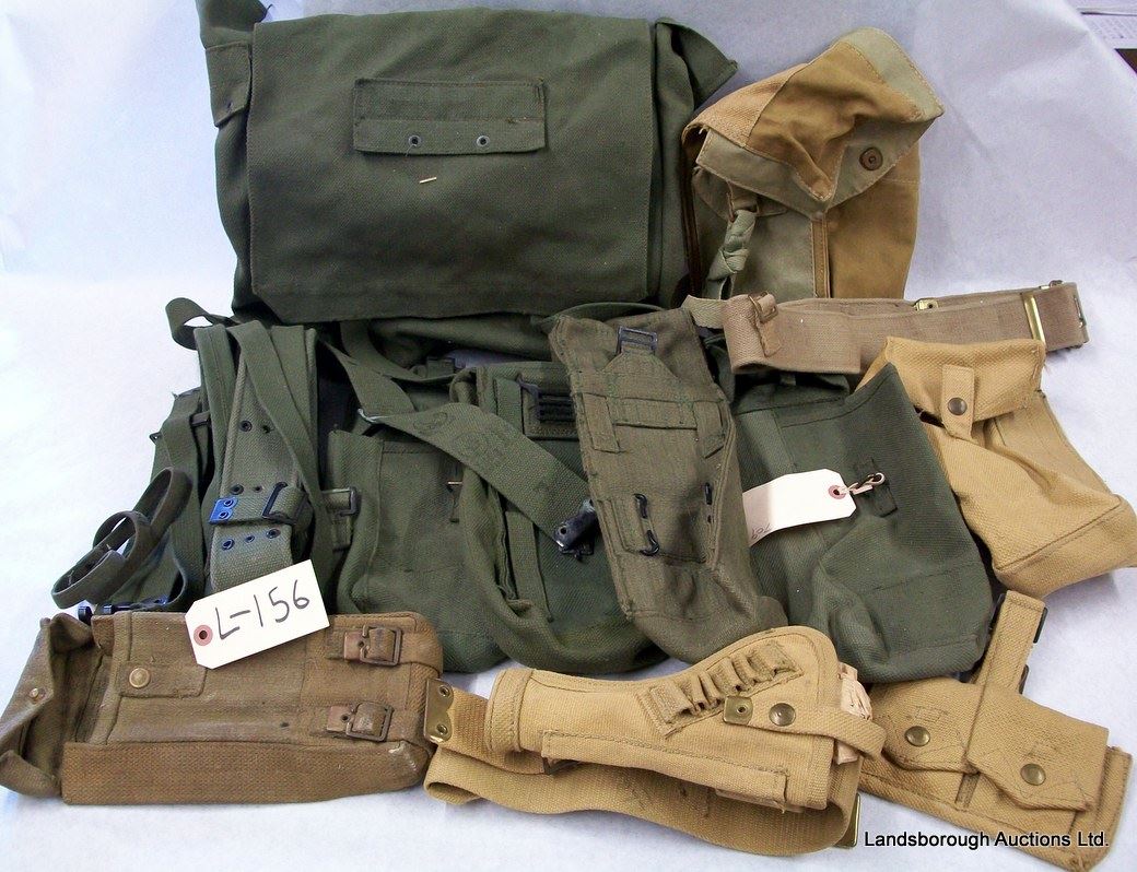 BEIGE HOLSTER AMMO POUCHES, KHAKI GREEN HAVERSACK POUCHES, BELTING AND SMALLER POUCHES.