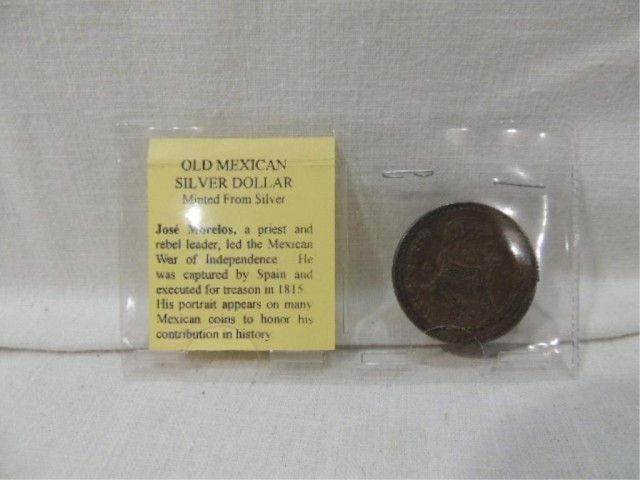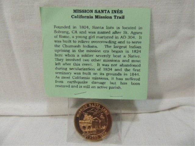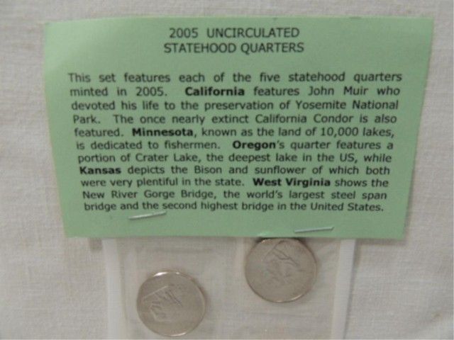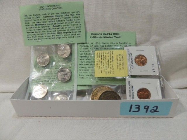 SET OF 5 2005 UNC STATEHOOD WASHINGTON QUARTERS, BRONZE MEDALLION OF THE MISSION SANTA INES, 1909 (G) CIRCULATED LINCOLN WHEAT PENNY, FOREIGN COIN 1958 MEXICAN 1 PESO, LOT 2 US COINS (UNC) 1957 & 58 WHEAT PENNIES.