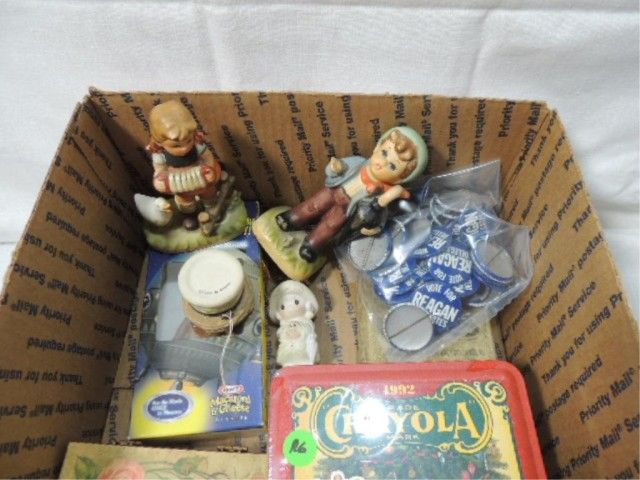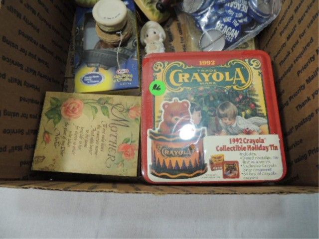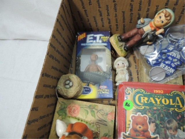 NICE BOX LOT MISCELLANEOUS COLLECTIBLES. REAGAN BUTTONS OR PINS, CRAYOLA CRAYON BOX, FIGURES, ANTIQUE BOOK AND MORE, AS SHOWN. SEE PICTURES FOR DETAILS.