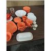 BOX LOT CONTEMPORARY TEXASWARE BOWLS, DINNER PLATES AND COFFE CUPS AND SAUCERS & MODERN RED PLASTIC COFFEE DISPENSER CUPS SAUCERS. CONTEMPORARY DESIGN. AS SHOWN VIEW PICTURE FOR DETAIL