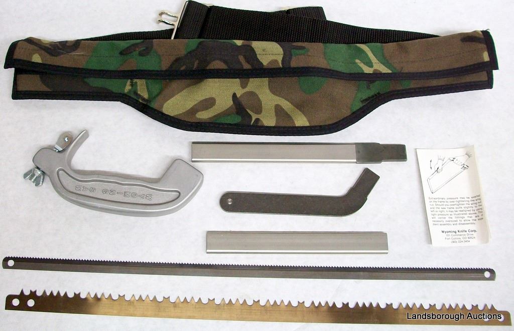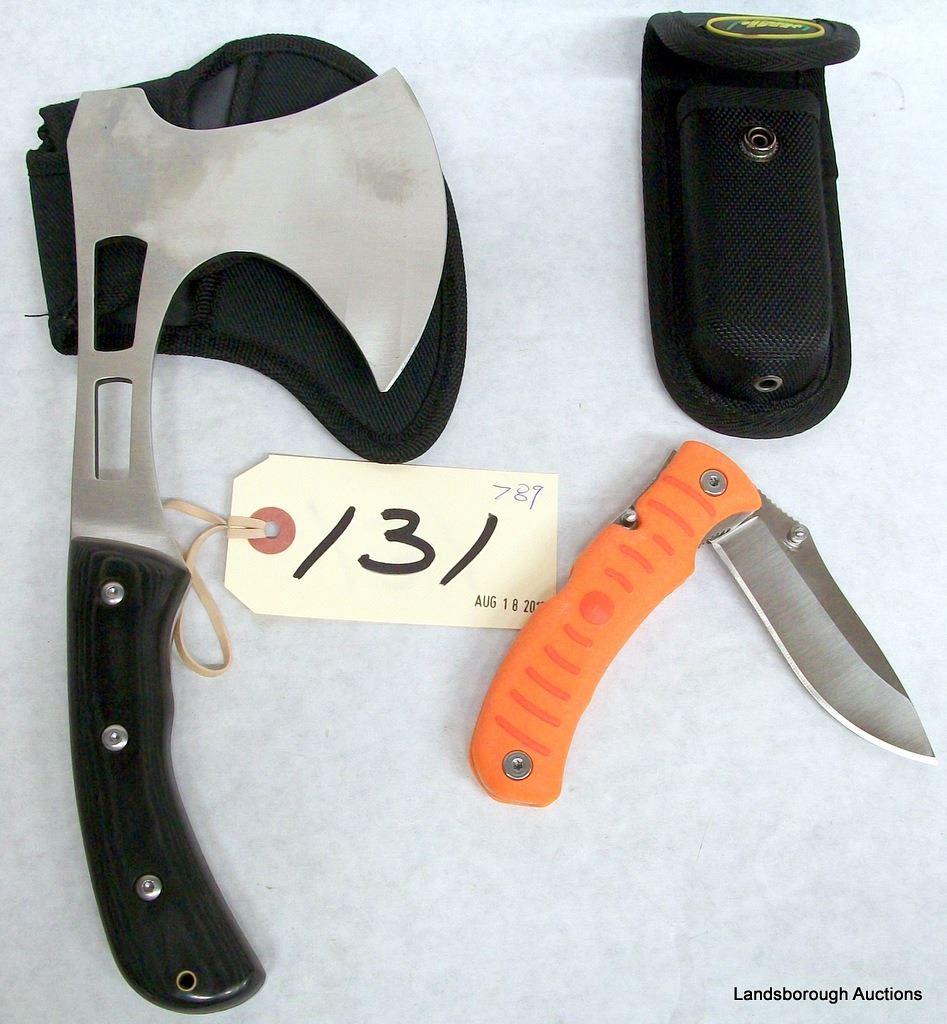 OUTDOOR EDGE FOLDING KNIFE, STAINLESS THIN BLADED HATCHET, WYOMING KNIFE CORP TAKEDOWN SAW IN WAIST POUCH. NEW.