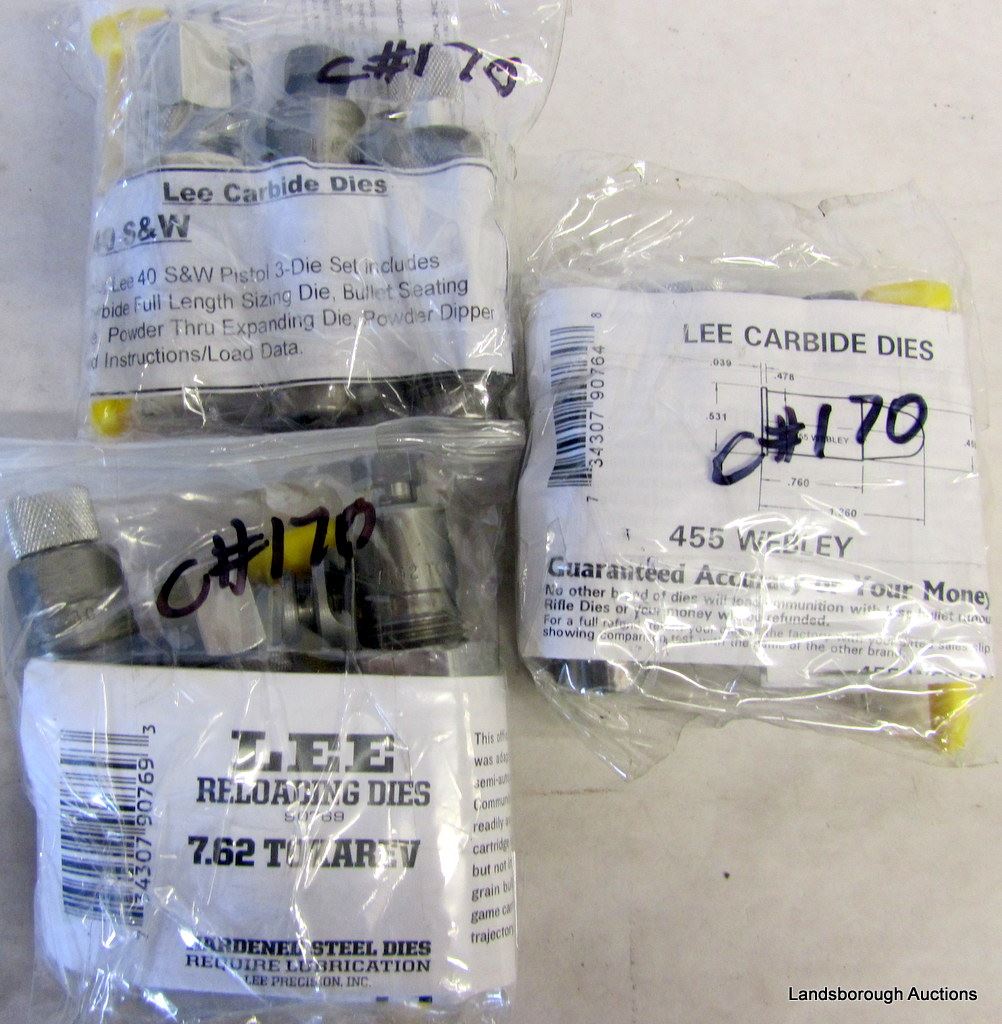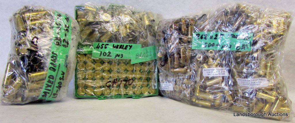 3 SETS LEE DIES 40 S&W455 WEBLEY,7.62 TOKAREV. COMES WITH 102 RDS OF 455 WEBLEY BRASS, 500 PEICES OF 7.62X25 BRASS MOSTLY NEW, AND 68PCS OF 45 COLT, 37 PCS OF 32 ACP AND 19 RDS OF 40 S&W.