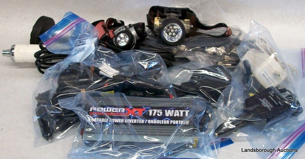 GENERIC ANTENNA, HUSTLER RESONATOR RM-40, 6 VARIOUS WALKIE TALKIE ANTENNAS, VARIOUS COAX CABLES, DURACELL MOBILE INVERTER, UNIVERSAL CAR CORD ADAPTER, NEXXTECH POWER ADAPTOR, 2 HEADLAMPS (BATTERIES INCLUDED), 12V ADAPTORS, GENDER CHAGERS, POWER XT 175 WATT POWER INVERTER