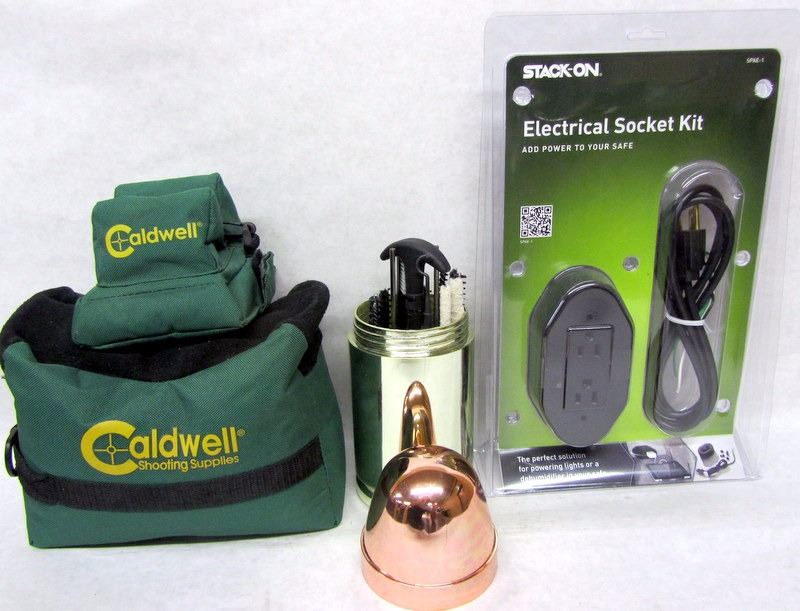 CLEANING KIT IN BULLET CASE, CALDWELL SHOOTING REST SET, AND STACK-ON GUN SAFE ELECTRICAL SOCKET KIT, NEW IN BOX.