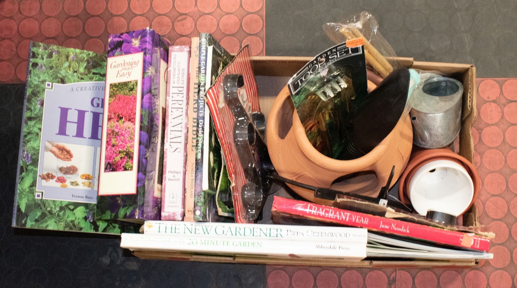 BOX LOT GARDENING, HERBS BOOKS, PLANTERS, TOOLS.