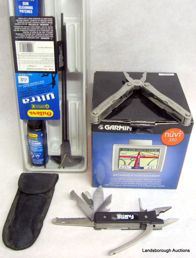 GARMIN NUVI 350, OUTERS GUN CLEANING KIT, WORLD FAMOUS MULTI TOOL, OUTDOOR EDGE TREK TOOL, THREE SOFT GUN CASES, TWO RAIN PONCHOS.