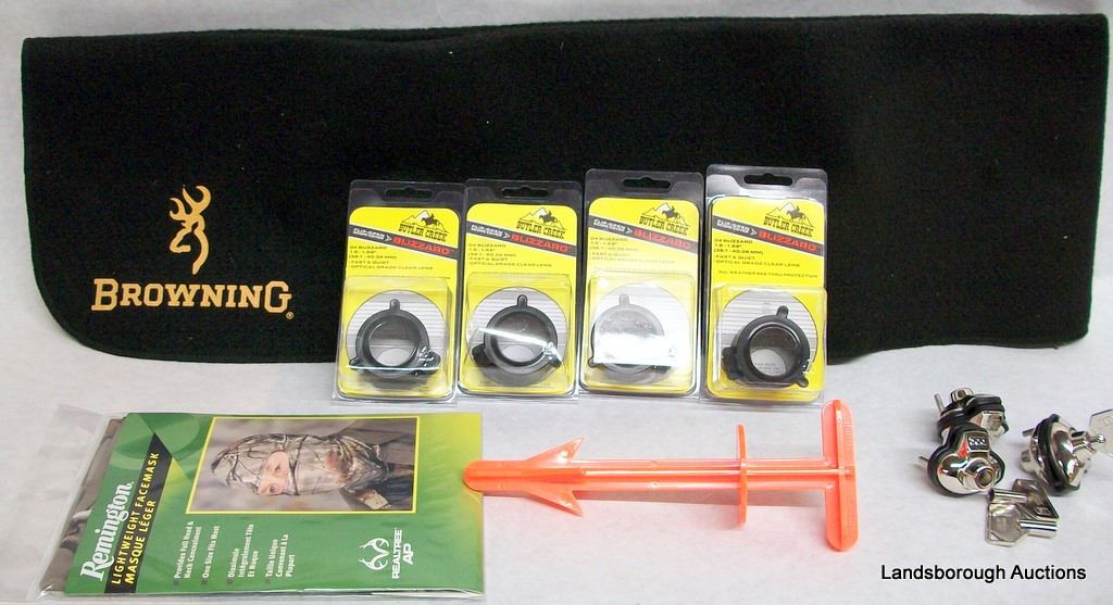 BROWNING CLEANING PAD, UNCLE MIKES SLIP ON RECOIL PAD, BUTLER CREEK FLIP OPEN SCOPE COVERS (FOUR O4 BLIZZARD), REMINGTON FACE MASK, CAMO SHIELD KIT, SHOOTING PAD, THREE TRIGGER LOCKS.