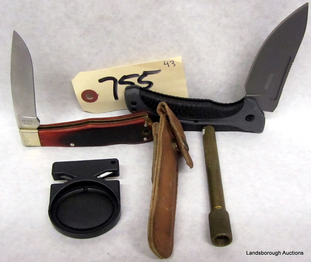 ONE KERSHAW FOLDING KNIFE, ONE REMINGTON BULLET KNIFE (2013 VINTAGE), AND TWO KNIFE SHARPENERS