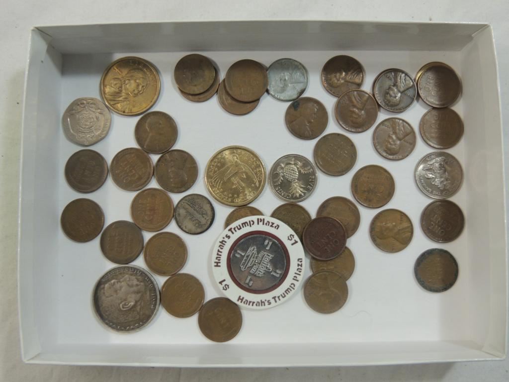 WHEAT PENNIES, TRUMP PLAZA TOKEN, VINTAGE COINS COIN COLLECTIBLES, CURRENCY COLLECTIBLE, FOREIGN COIN COLLECTIBLE, COIN COLLECTORS, AS SHOWN SEE PHOTO FOR MORE DETAILS.