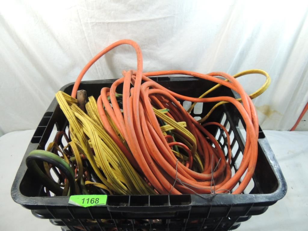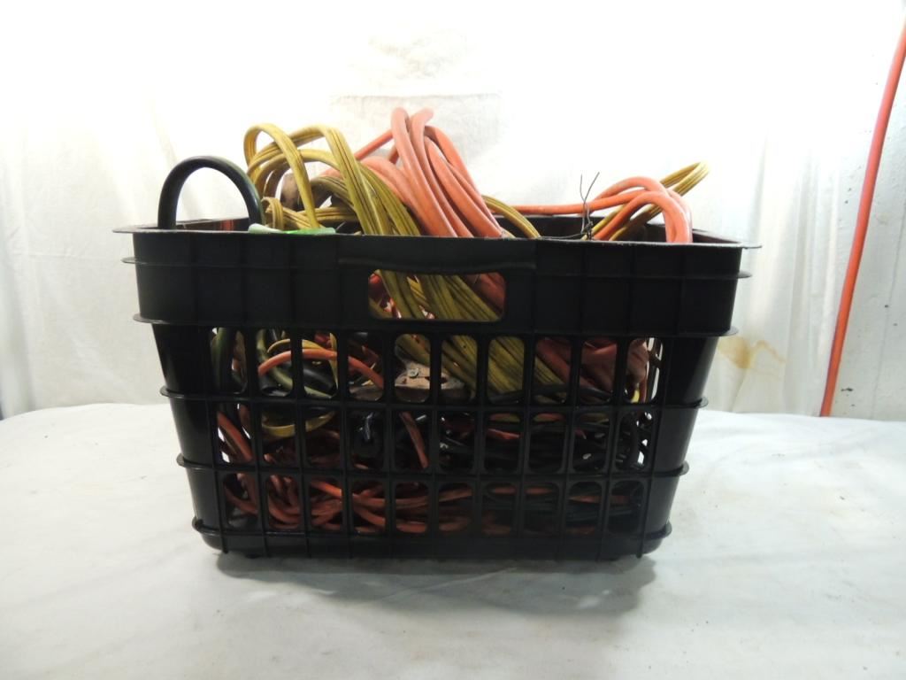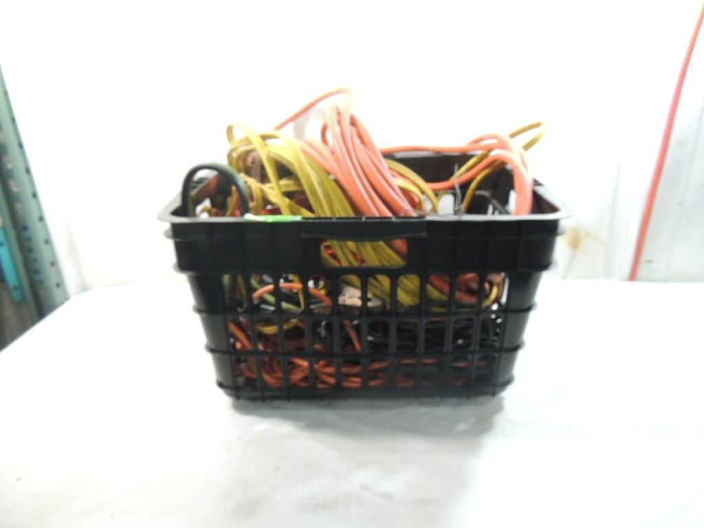 BOX LOT MISC EXTENTION CORDS, JUMP CABLES,