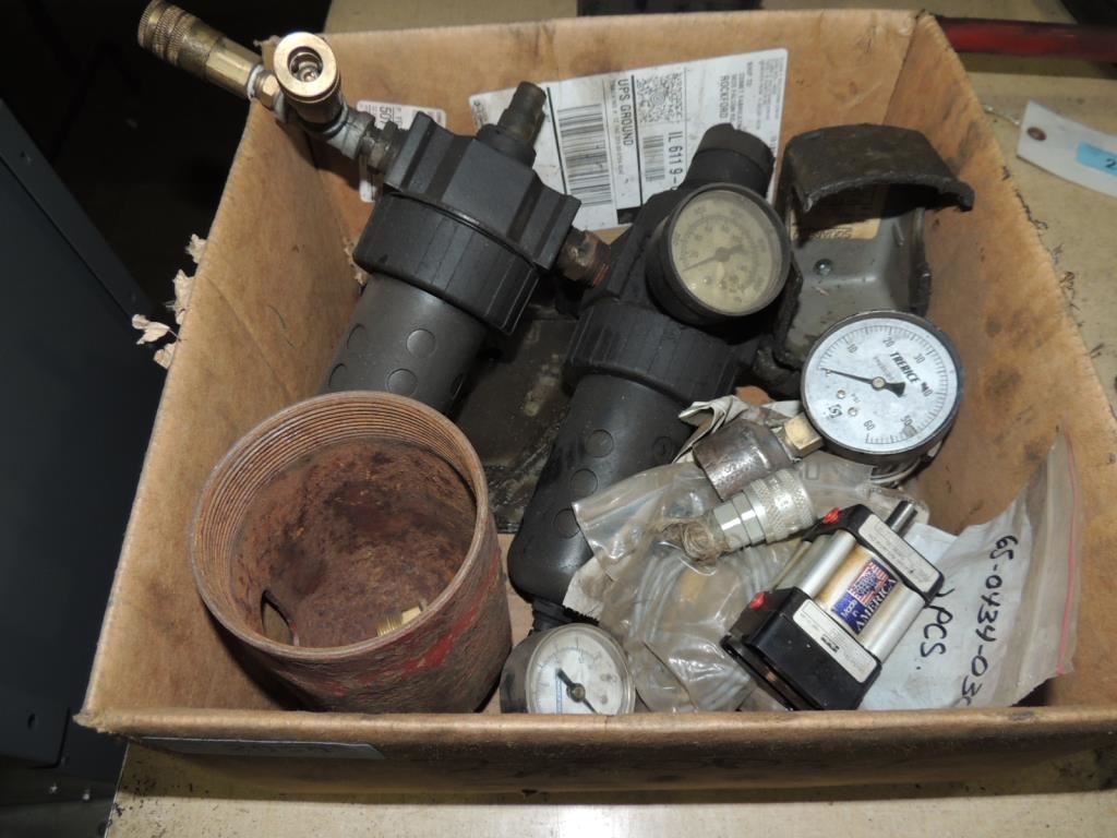 BOX LOT MISC GAUGES, FILTERS, CYLINDERS