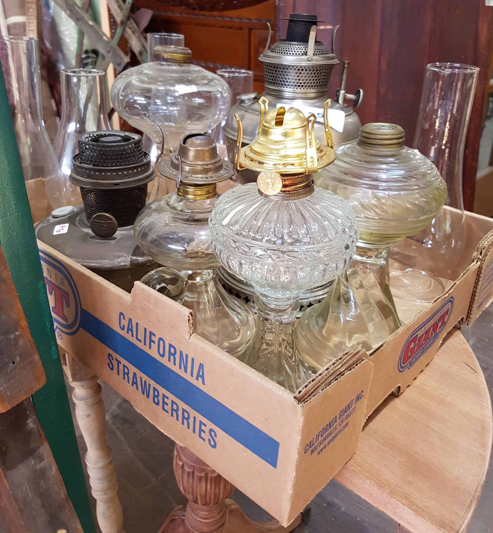 BOX LOT MISC OIL LANTERNS & CHIMNEYS