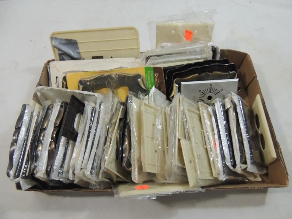 PLASTIC AND METAL ASSORTED OUTLET COVERS, ELECTRICAL OUTLET COVER, SWITCH COVERS, AS SHOWN SEE PHOTO FOR MORE DETAILS.