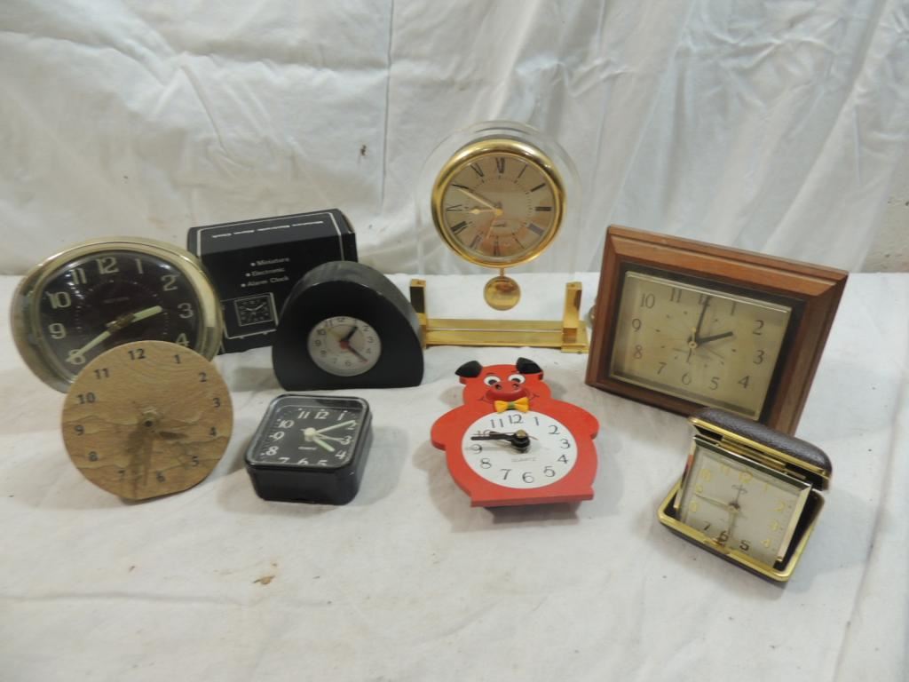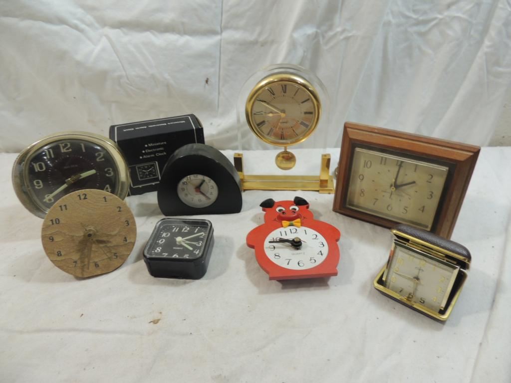 TABLE TOP CLOCKS, VINTAGE CLOCKS, TRAVEL CLOCKS, DESK CLOCKS, ALARM CLOCK, AWARD CLOCK, NOVELTY CLOCK AS SHOWN SEE PHOTO FOR MORE DETAILS.