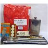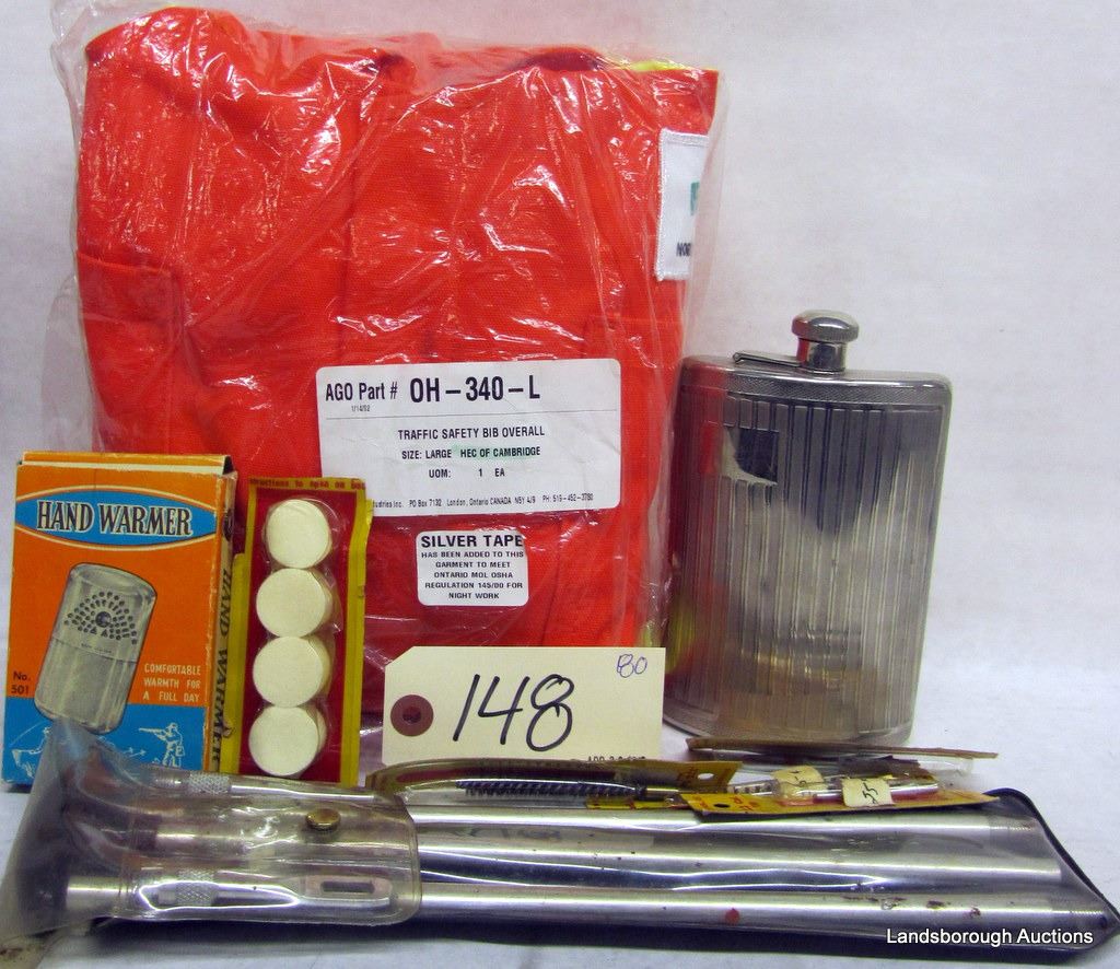 ONE LARGE CLEANING ROD, 3 SMALL CLEANING ROD HEADS, PACK OF OPENED PATCHES, ONE FLASK, ONE HAND WARMER, AND ONE PAIR OF LARGE ORANGE COVERALLS NEW STILL IN PACKAGE- ONTARIO APPROVED FOR NIGHT WORK.