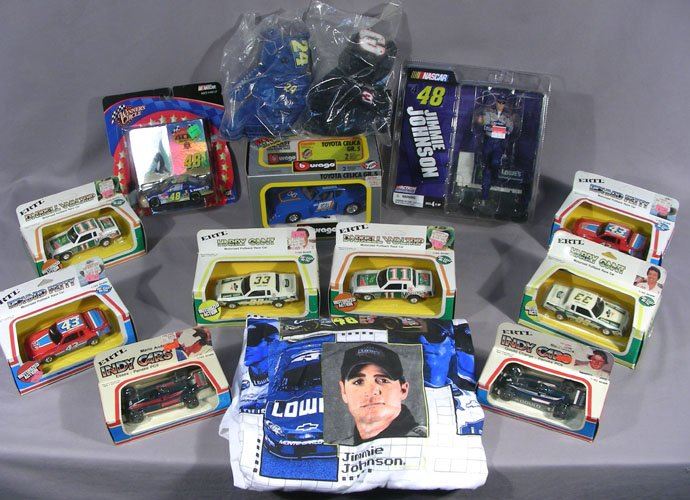 Including: 2 Ertl Indy cars, 6 Ertl motorized pole back race cars, a Jimmy Johnson shirt, a Jimmy Johnson figure in original box, 2 Beanie Babies (Dale Earnhardt & Jeff Gordon, a winners circle Jimmy Johnson Chevy race car 1:43 scale and Burago race car 1:24 scale in original box.