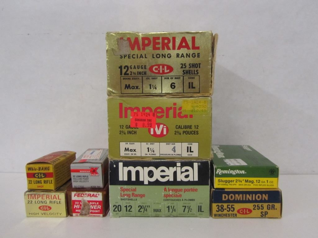 THREE BOXES IMPERIAL SHOTGUN SHELLS (BOX LABELS DO NOT MATCH CONTENTS! BUYER BEWARE), ONE BOX IMPERIAL 22 LR HIGH VELOCITY (BRASS AND LIVE), FEDERAL HI-POWER 22LR 100RND BOX (PART BOX), ONE BOX WINCHESTER 22LR HIGH