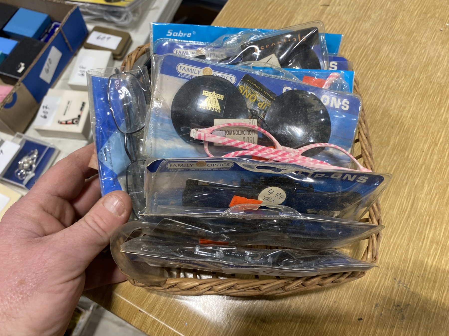 BOX LOT OF ASSORTED CLIP ON SUNGLASSES