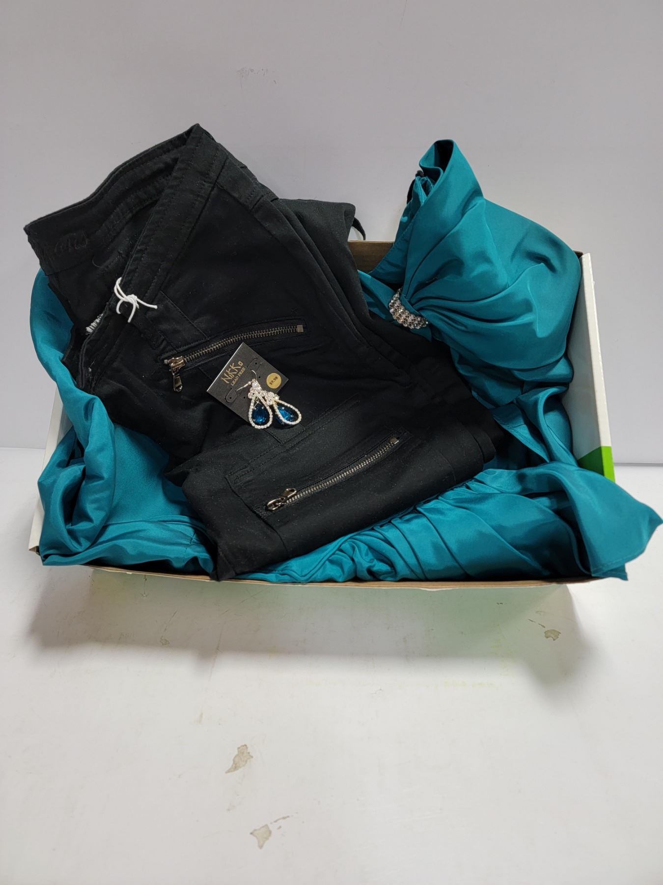 INCLUDING MEDIUM SIZED JACKET/BLAZER, SIZE 3 CARGO PANTS WITH FASHOINABLE ZIPPERS, A PAIR OF PEARL EARRINGS
