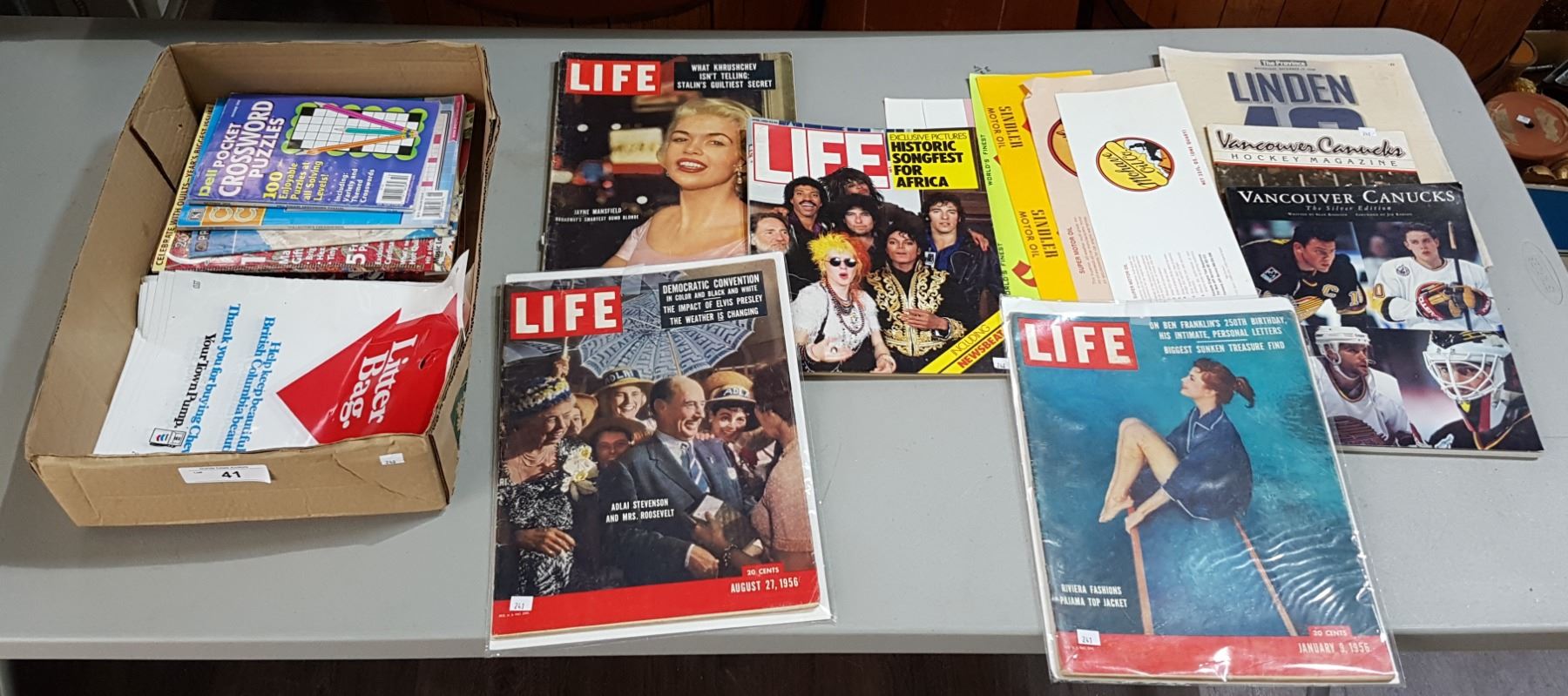 VINTAGE LIFE MAGAZINES, OIL CAN LABELS, CHEVRON GAS STATION TRASH BAGS, ETC