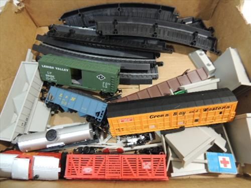 BOX LOT OF LIFE LIKE ELECTRIC TRAIN PIECES: TRACKS, NO ENGINE, 7 TRAIN CARS, TRUSSES AND MORE.  AS SHOWN.  VIEW PICTURE FOR DETAIL.