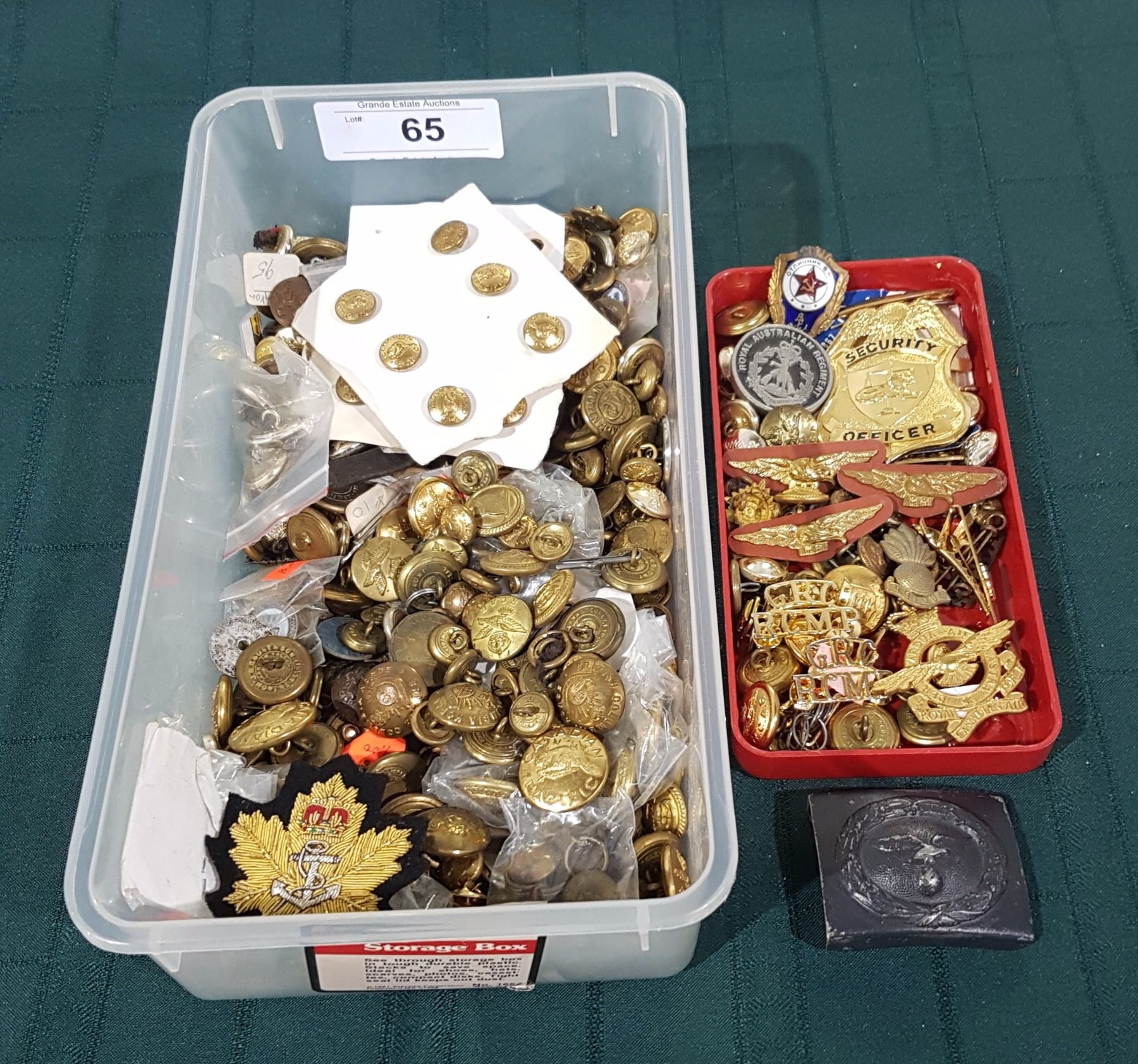 BOX LOT OF MISC UNIFORM BUTTONS, BADGES ETC