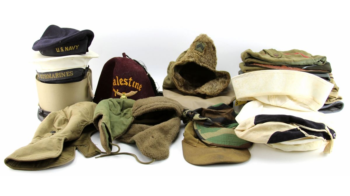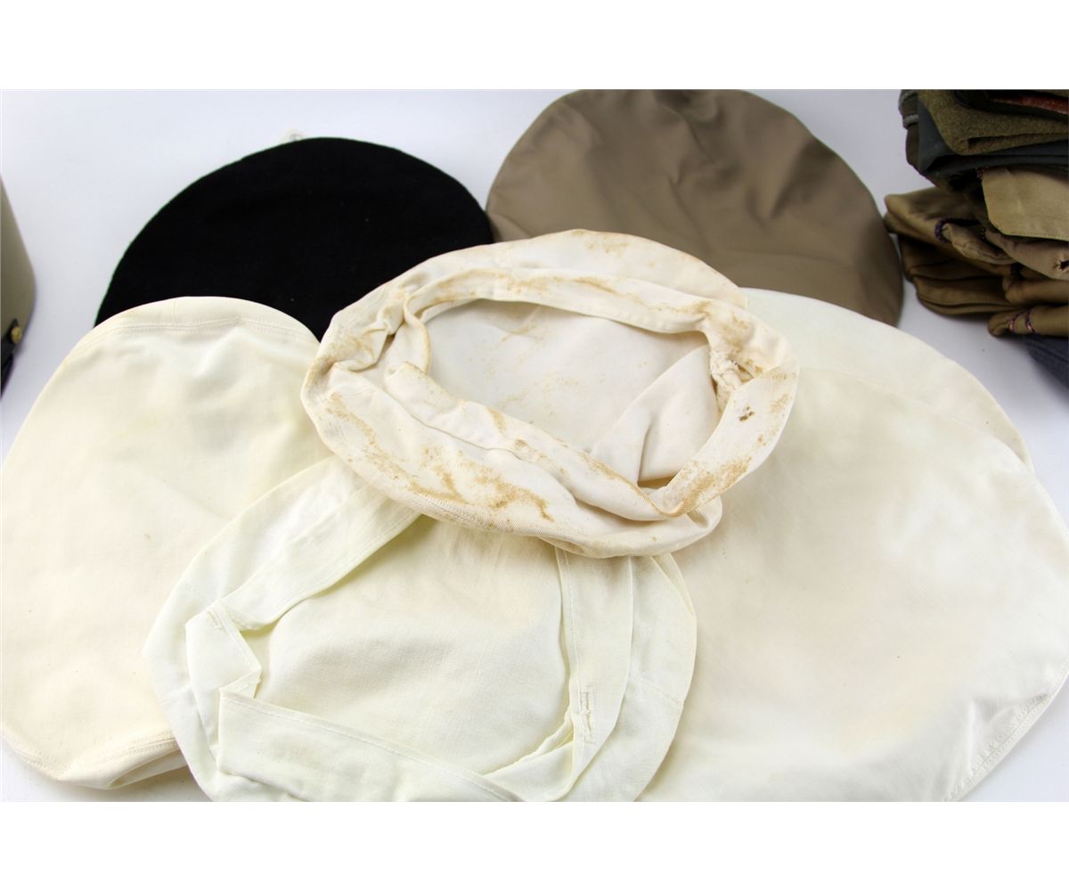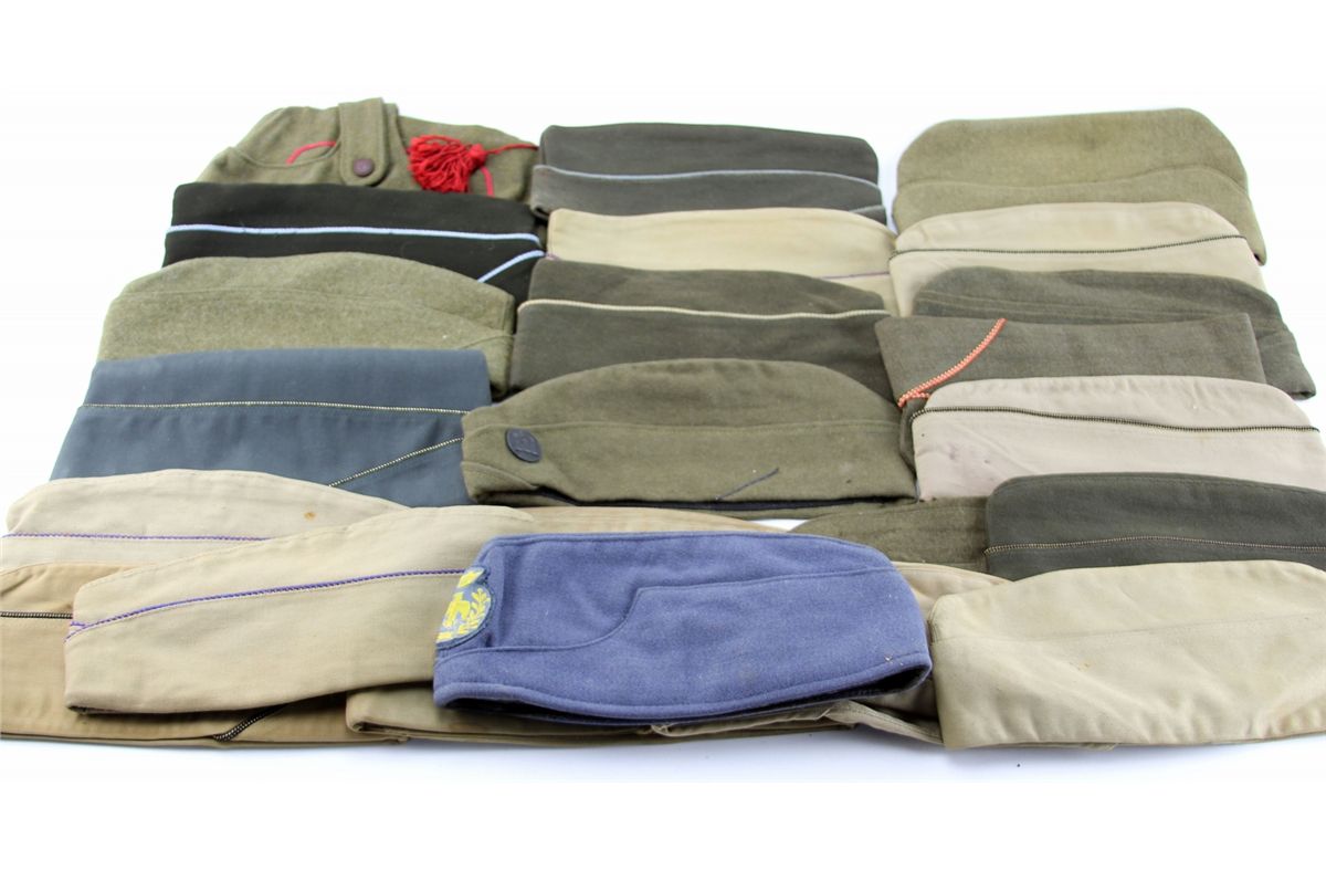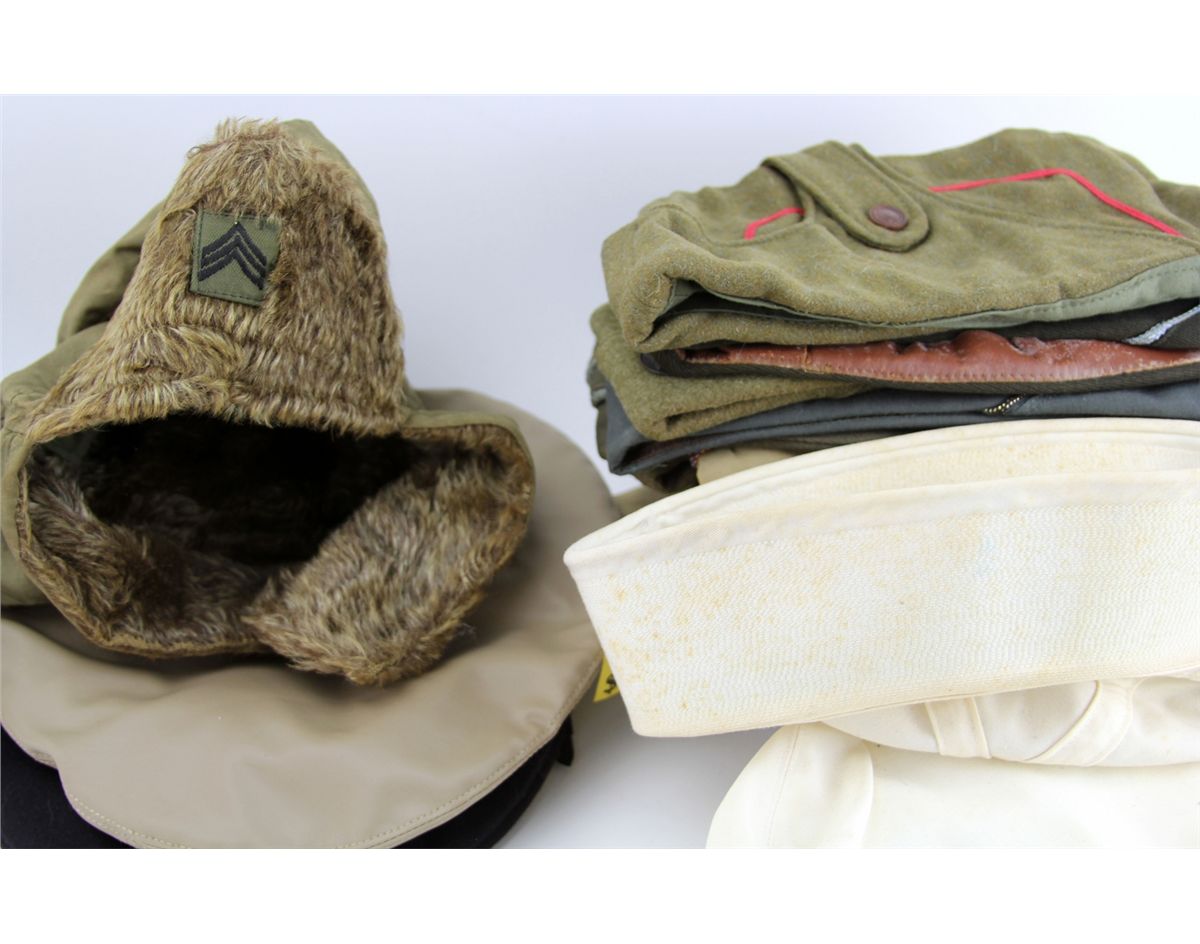 BOX LOT OF OVER 42 VARIOUS MILITARY HATS Mixed box bonanza lot of over 42 various military hats, including 22 overseas caps, as well as flight, navy, shriners, and more. One cap shows writing from service in China Burma India theater of WWII. Some gloves and other garments also included. Country: Mixed Condition: Various mixed condition