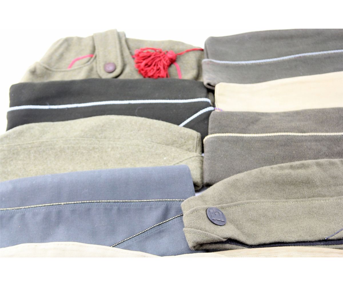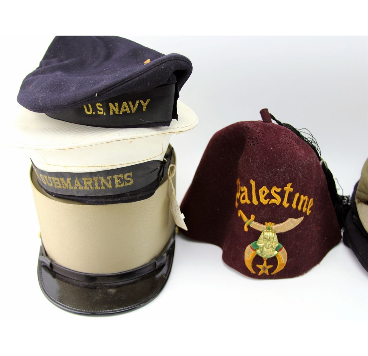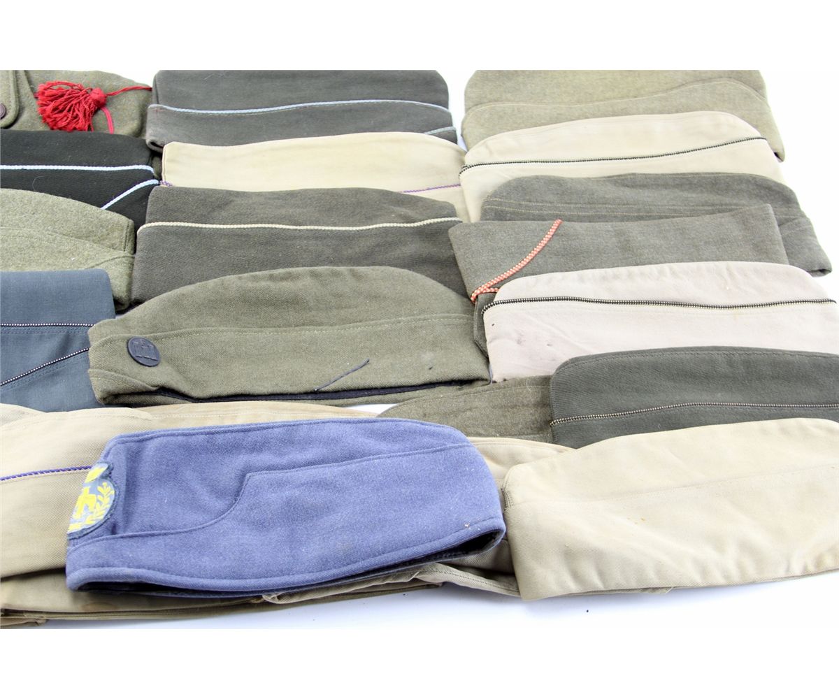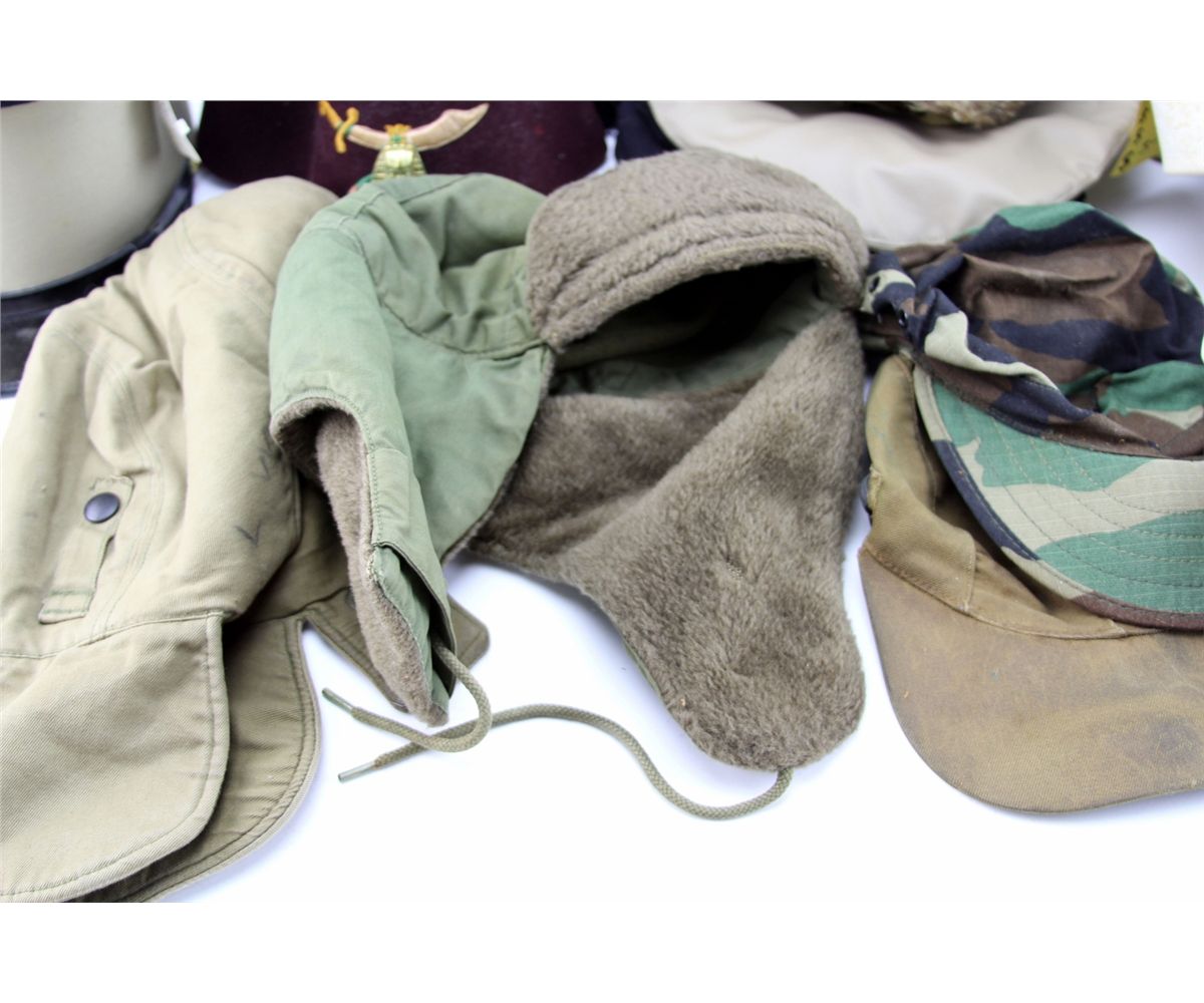 BOX LOT OF OVER 42 VARIOUS MILITARY HATS Mixed box bonanza lot of over 42 various military hats, including 22 overseas caps, as well as flight, navy, shriners, and more. One cap shows writing from service in China Burma India theater of WWII. Some gloves and other garments also included. Country: Mixed Condition: Various mixed condition