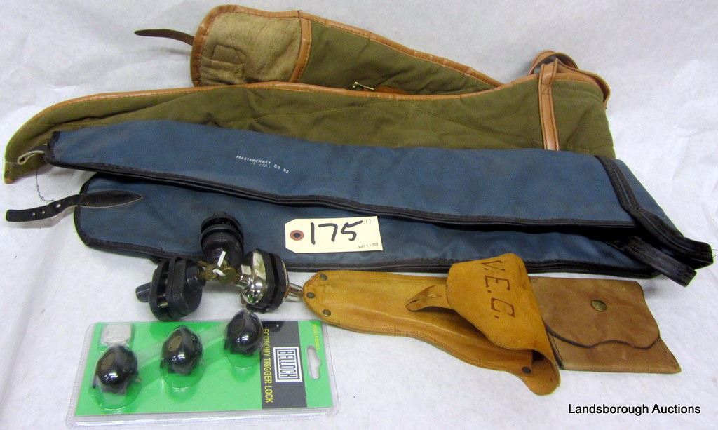 THREE LARGE CANVAS BAGS, TWO SOFT GUN CASES, ONE MEDIUM AMMO POUCH, ONE LEATHER HOLSTER INITIALED "VEC", ONE SMALL UNKNOWN POUCH, AND 6 TRIGGER LOCKS