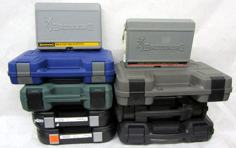 ASSORTMENT OF EMPTY SHIPPING CASES FOR HANDGUNS. 9 CASES. INCLUDES SMITH AND WESSON, GLOCK, BROWNING, AND PARA.