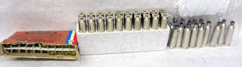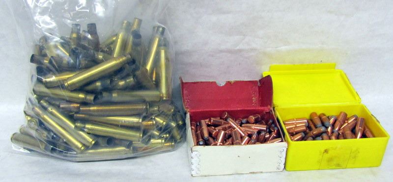 APPROXIMATELY 100 FIRED 30-06 BRASS, 35 300 WSM BRASS, 19 308 WIN BRASS. 2 BOXES 30 CALIBER BULLETS. ONE FULL, ONE 80% FULL.