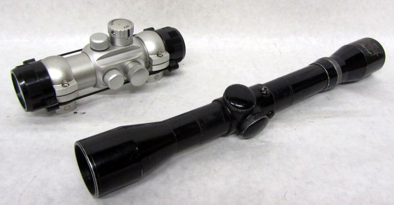 TASCO PRO POINT RED DOT, FUNCTIONS PERFECTLY. J.C. HIGGINS 4X32 SCOPE. HAS WEAR, AND IS SLIGHTLY CLOUDY.