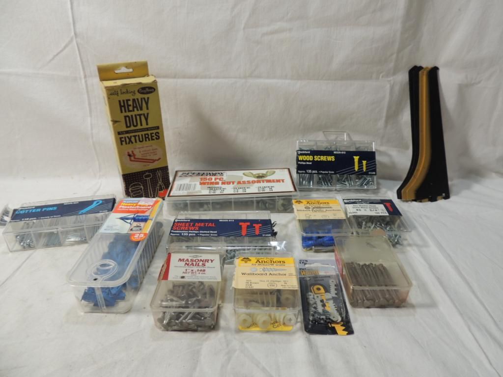 BOX LOT ASSORTED SCREWS ANCHORS FIXTURES. AS SHOWN. SEE PHOTO FOR MORE DETAILS