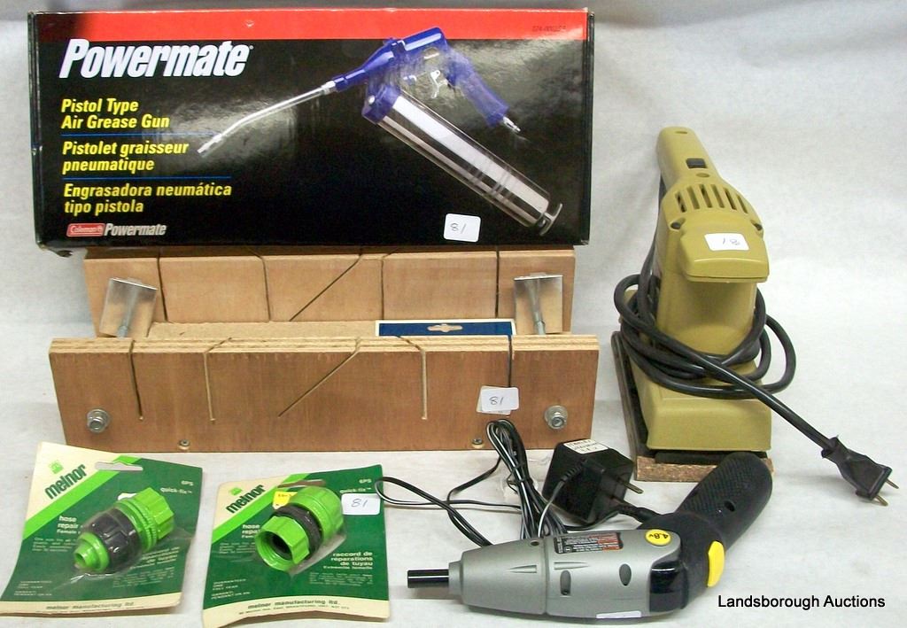 NEW POWERMATE GREASE GUN, NEW MITRE BOX, THREE NEW 7 1/4 IN SAW BLADES, BLACK AND DECKER SANDER, STANLEY CORDLESS SCREWDRIVER, MELNOR HOSE COUPLERS, VOICI INDOOR WATERING SYSTEM.