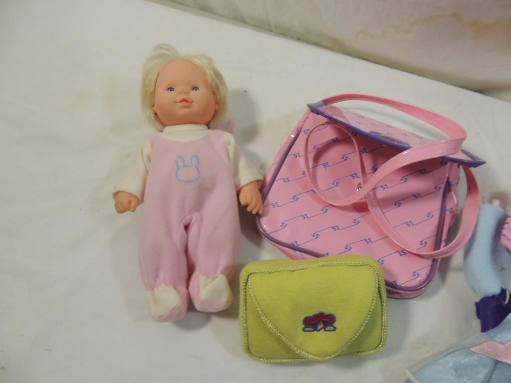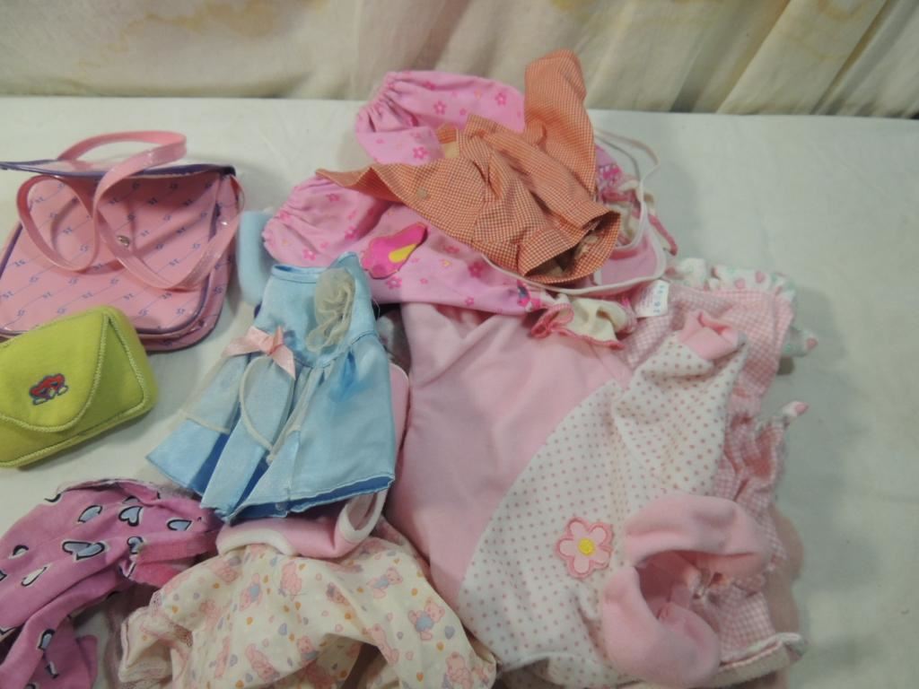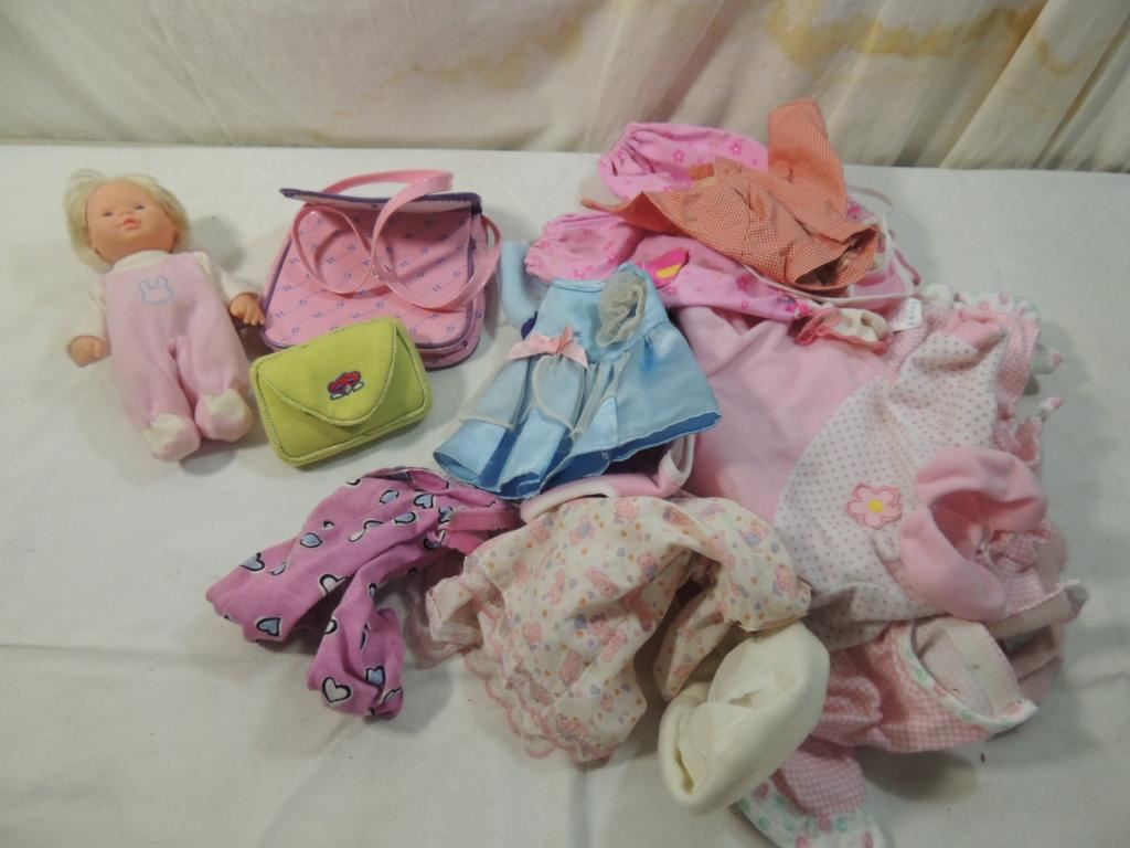 SMALL BABY DOLL, ASSORTED DOLL CLOTHES, TOY PURSE, ACCESSORIES AS SHOWN SEE PHOTO FOR MORE DETAILS.